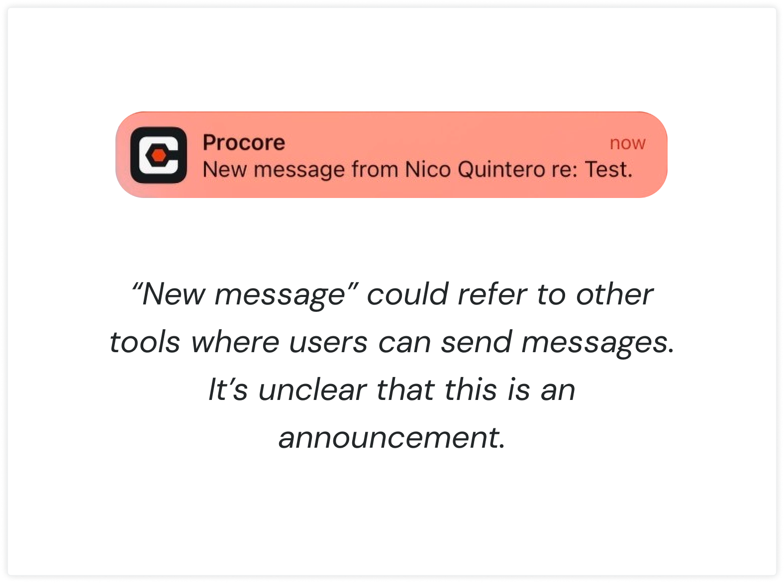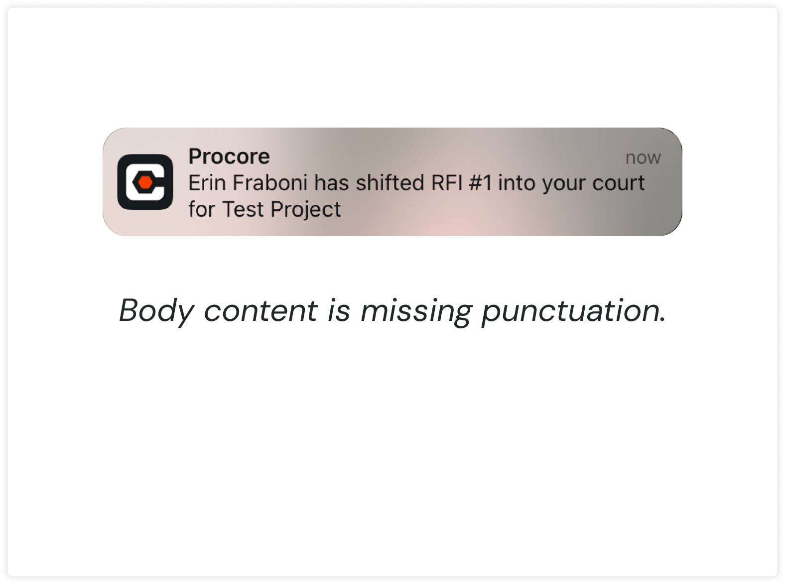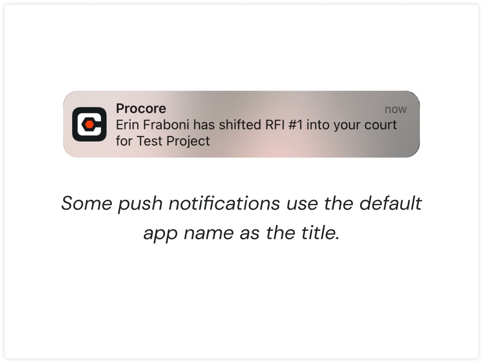 The content was inconsistent and did not follow any rules or patterns. For example, some push notifications would use the app name (Procore) as default title and some would use the item name and number.