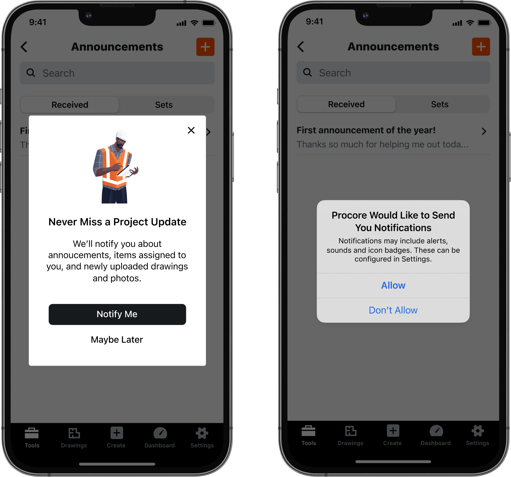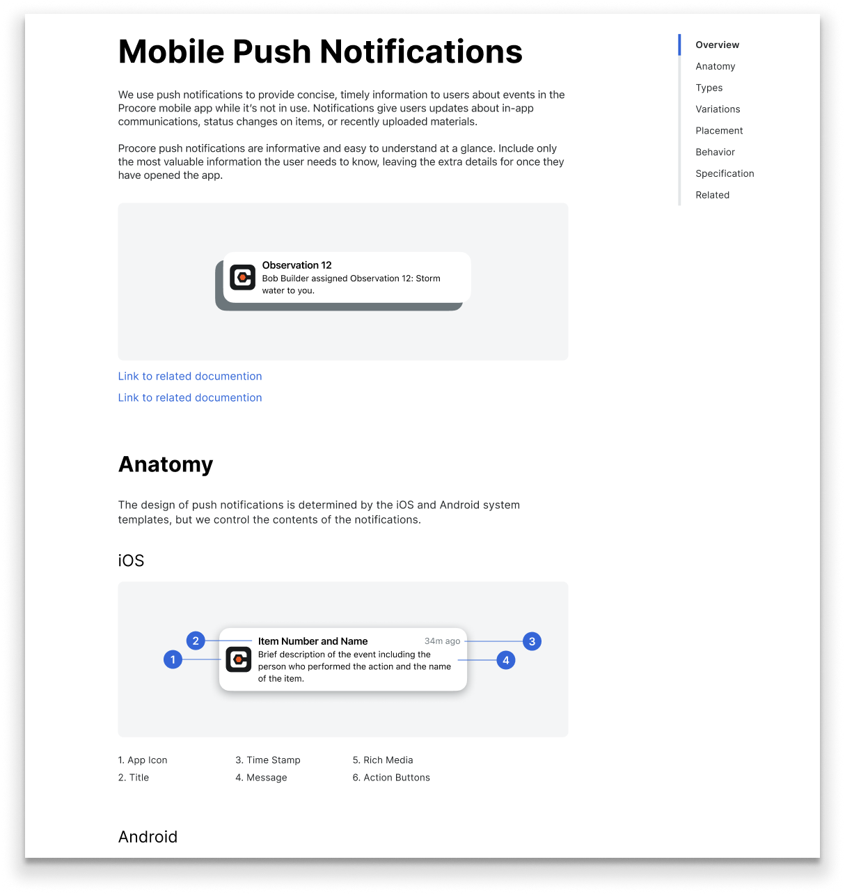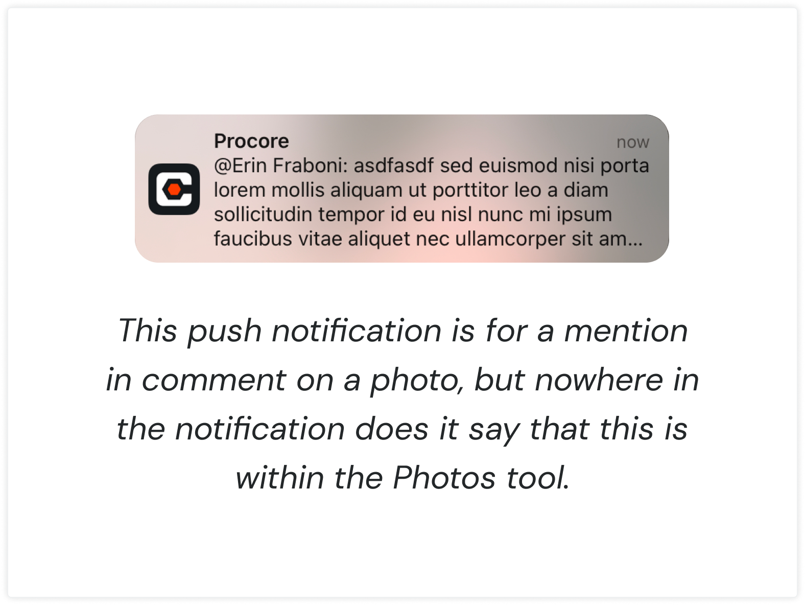 The content was inconsistent and did not follow any rules or patterns. For example, some push notifications would use the app name (Procore) as default title and some would use the item name and number.