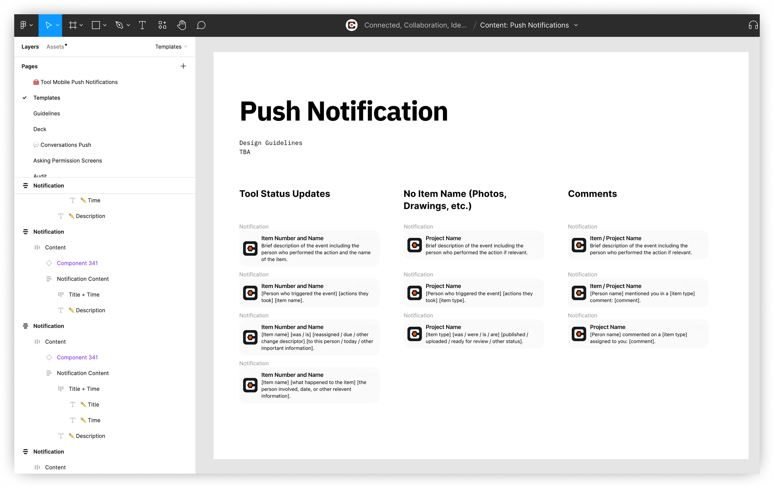 I created content templates as Figma components to ensure push notification content is consistent across tools and notification events and follows our writing guidelines.