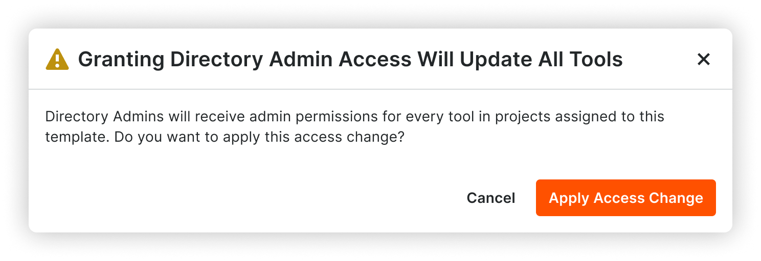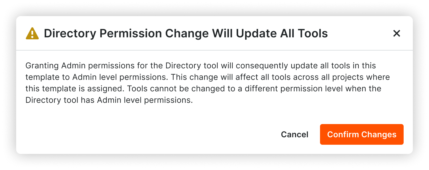 When a user is editing a permissions template, they may be shown a warning or information modal. Examples include: