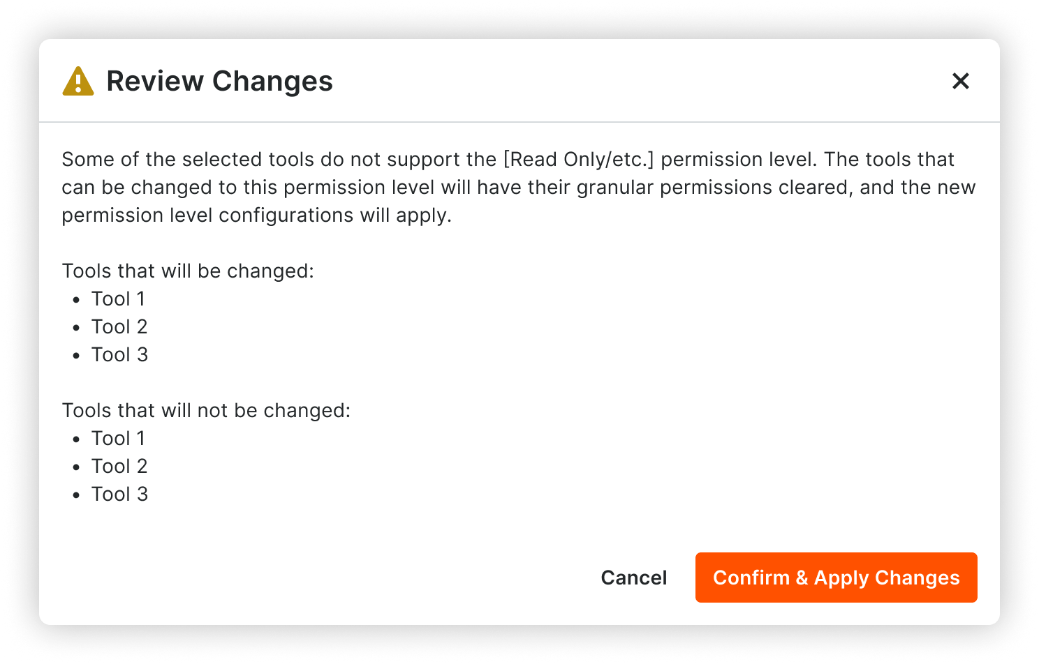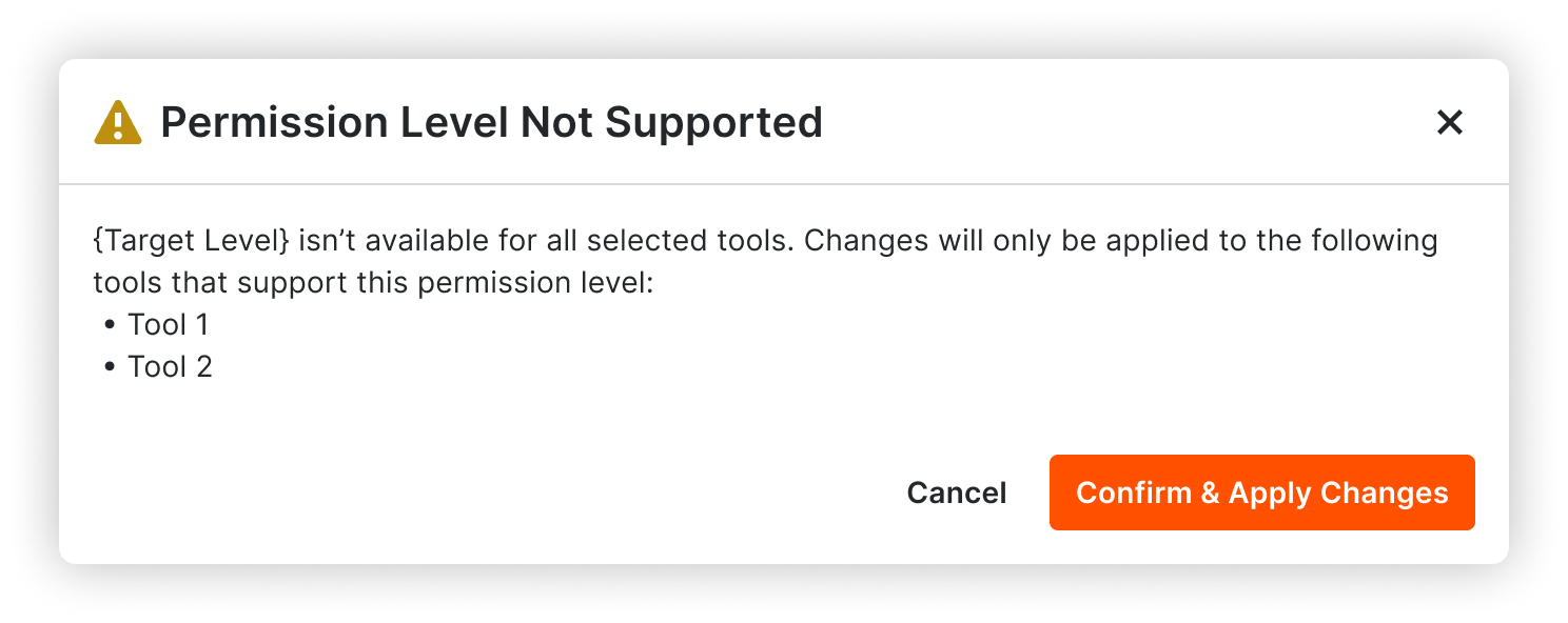 Information modal informing the user that some tools do not support the selected permission level
