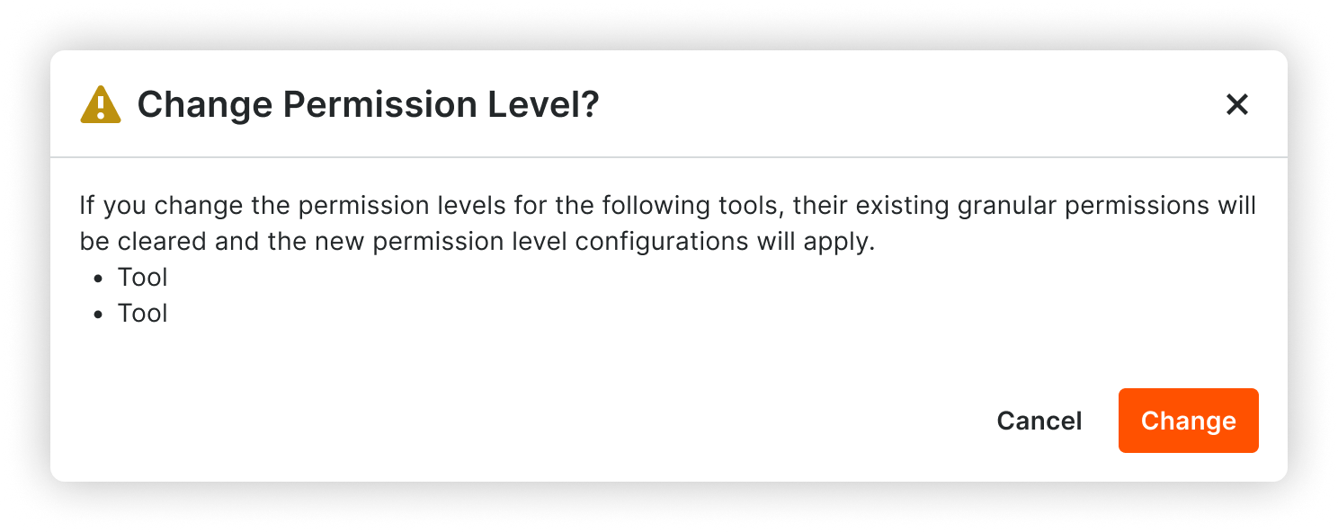 Warning modal informing the user that granular permissions will be cleared upon changing