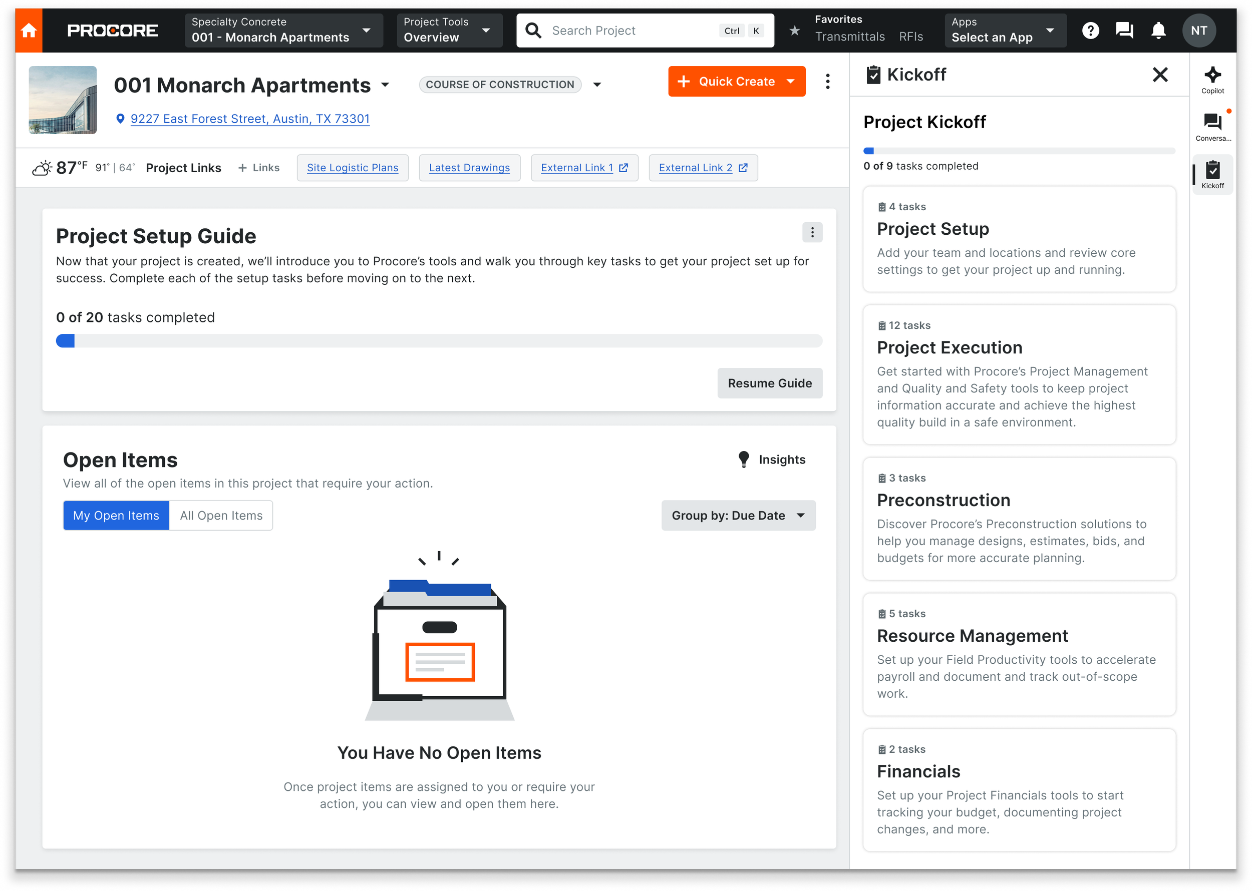 After Kickoff: Side panel broken down by tool category allowing users to get started on learning how to set up and use their Procore tools.