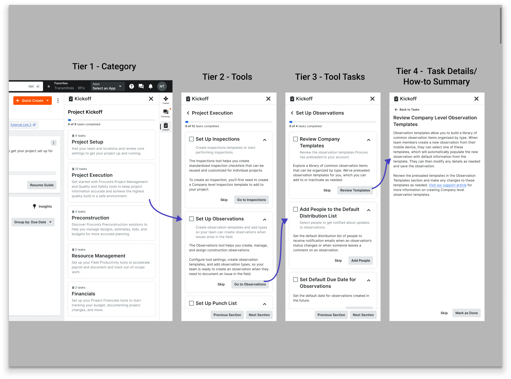 We settled on “4-tier” checklist design, in which customers would drill down from the tool category > tool > onboarding steps > conversational support summary to learn how to complete a task without having to navigate away from the product